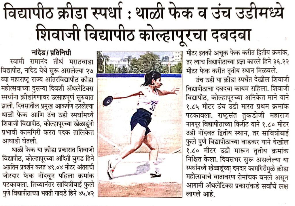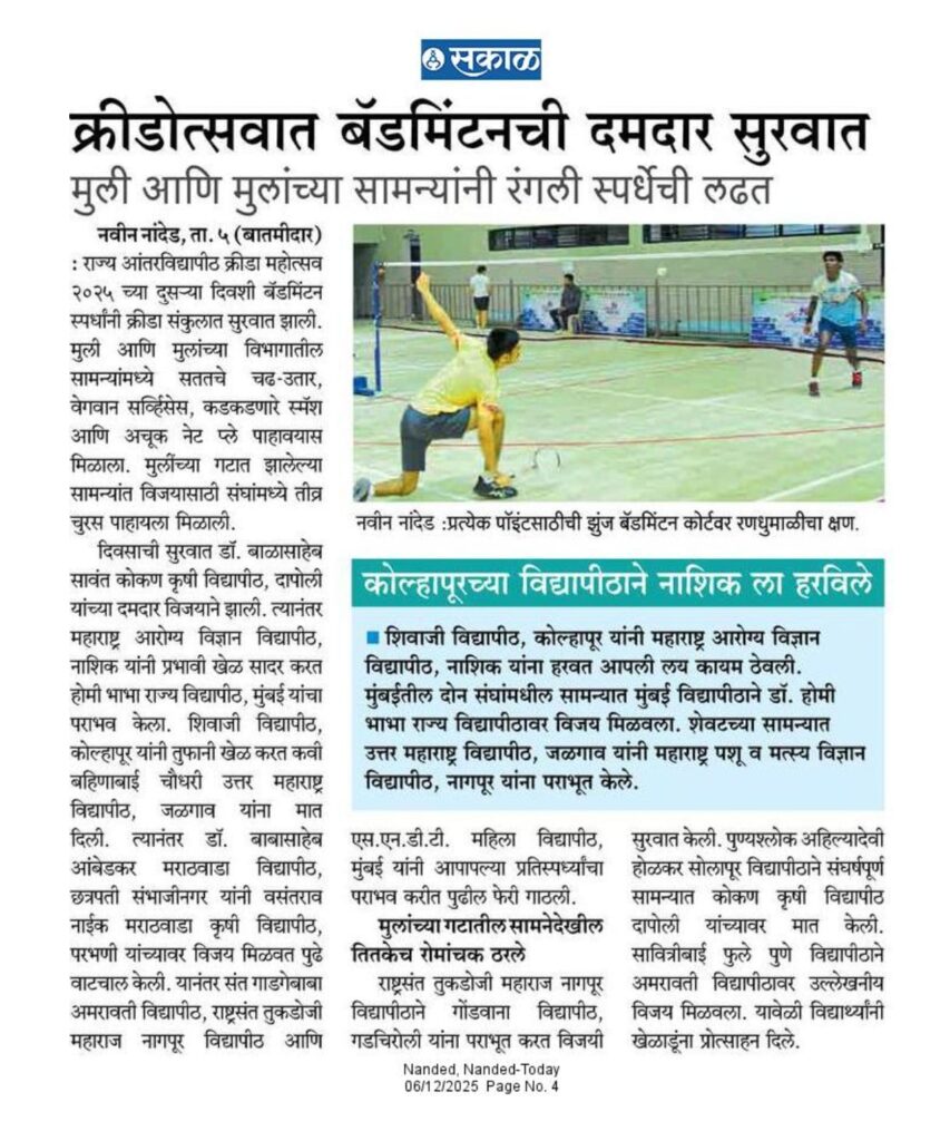 क्रीडा महोत्सव: बॅडमिंटन स्पर्धेत रोमांचक सामने स्वामी रामानंद मराठवाडा विद्यापीठ, नांदेड येथे सुरू असलेल्या २७ व्या महाराष्ट्र राज्य आंतरविद्यापीठ क्रीडा महोत्सव २०२५ च्या दुसऱ्या दिवशी बॅडमिंटन मुली व मुलांच्या गटात रोमांचक सामन्यांनी उत्साहाचे वातावरण रंगतदार झाले. मुलींच्या गटात झालेल्या सामन्यांमध्ये डॉ. बाळासाहेब सावंत कोकण कृषी विद्यापीठ, दापोली यांनी यशवंतराव चव्हाण महाराष्ट्र विद्यापीठ, नाशिक यांच्यावर सरशी साधत दिवसाची विजयी सुरुवात केली. त्यानंतर महाराष्ट्र आरोग्य विज्ञान विद्यापीठ, नाशिक यांनी उत्कृष्ट कामगिरी करत होमी भाभा राज्य विद्यापीठ, मुंबई यांना पराभूत केले. शिवाजी विद्यापीठ, कोल्हापूर यांनी दमदार खेळ सादर करत कवी बहिणाबाई चौधरी उत्तर महाराष्ट्र विद्यापीठ, जळगाव यांना मात दिली. तसेच डॉ. बाबासाहेब आंबेडकर मराठवाडा विद्यापीठ, छत्रपती संभाजीनगर यांनी वसंतराव नाईक मराठवाडा कृषी विद्यापीठ, परभणी यांचा पराभव करत विजय नोंदवला. यानंतर संत गाडगेबाबा अमरावती विद्यापीठ यांनी डॉ. पंजाबराव देशमुख कृषी विद्यापीठ, अकोला यांना हरवत यश मिळविले. तसेच राष्ट्रसंत तुकडोजी महाराज नागपूर विद्यापीठ यांनी गोंडवाना विद्यापीठ, गडचिरोली यांचा पराभव तर एस.एन.डी.टी. महिला विद्यापीठ, मुंबई यांनी छत्रपती संभाजीनगर विद्यापीठ संघावर विजय मिळवला. मुलांच्या गटातही तितकेच चुरसपूर्ण सामने पार पडले. राष्ट्रसंत तुकडोजी महाराज नागपूर विद्यापीठ यांनी गोंडवाना विद्यापीठ, गडचिरोली यांना पराभूत केले. पुण्यश्लोक अहिल्यादेवी होळकर सोलापूर विद्यापीठ यांनी संघर्षमय सामन्यात कोकण कृषी विद्यापीठ, दापोली यांचा पराभव केला. सावित्रीबाई फुले पुणे विद्यापीठ यांनी अमरावती विद्यापीठ यांच्यावर उल्लेखनीय विजय मिळवला. शिवाजी विद्यापीठ, कोल्हापूर यांनी महाराष्ट्र आरोग्य विज्ञान विद्यापीठ, नाशिक यांच्यावर मात करून पुढे मजल मारली. मुंबईतील दोन संघांमध्ये झालेल्या सामन्यात मुंबई विद्यापीठ यांचा डॉ. होमी भाभा राज्य विद्यापीठ यांच्यावर विजय झाला. तर उत्तर महाराष्ट्र विद्यापीठ, जळगाव यांनी महाराष्ट्र पशु व मत्स्य विज्ञान विद्यापीठ, नागपूर यांना पराभूत करत सामन्याची सांगता विजयाने केली. क्रीडांगणात दिवसभर सर्व संघांनी शिस्तबद्ध खेळ, ऊर्जस्वल स्पर्धा आणि खेळाडूपणाचा उत्तम प्रत्यय देत उत्साहपूर्ण वातावरण निर्माण केले.
